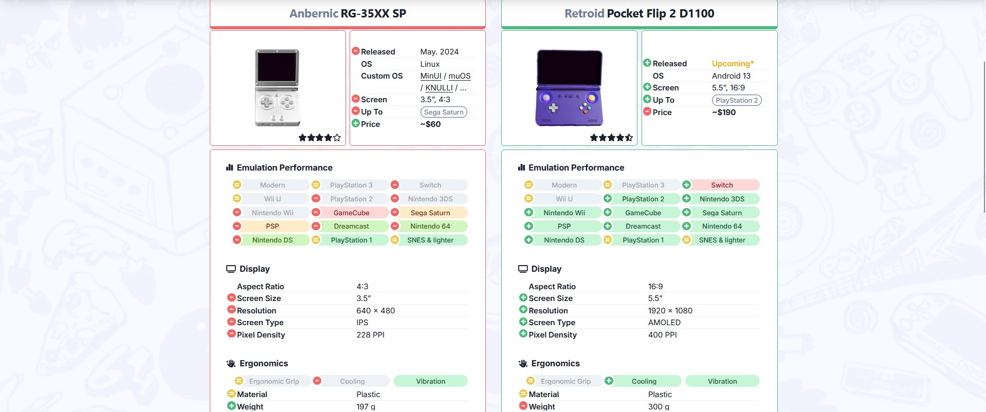 La véritable force du site réside dans son comparateur. À l’instar des sites comparatifs pour les téléphones portables, vous pouvez sélectionner deux consoles et le site vous présentera de manière claire et pertinente les différences entre les deux périphériques.
