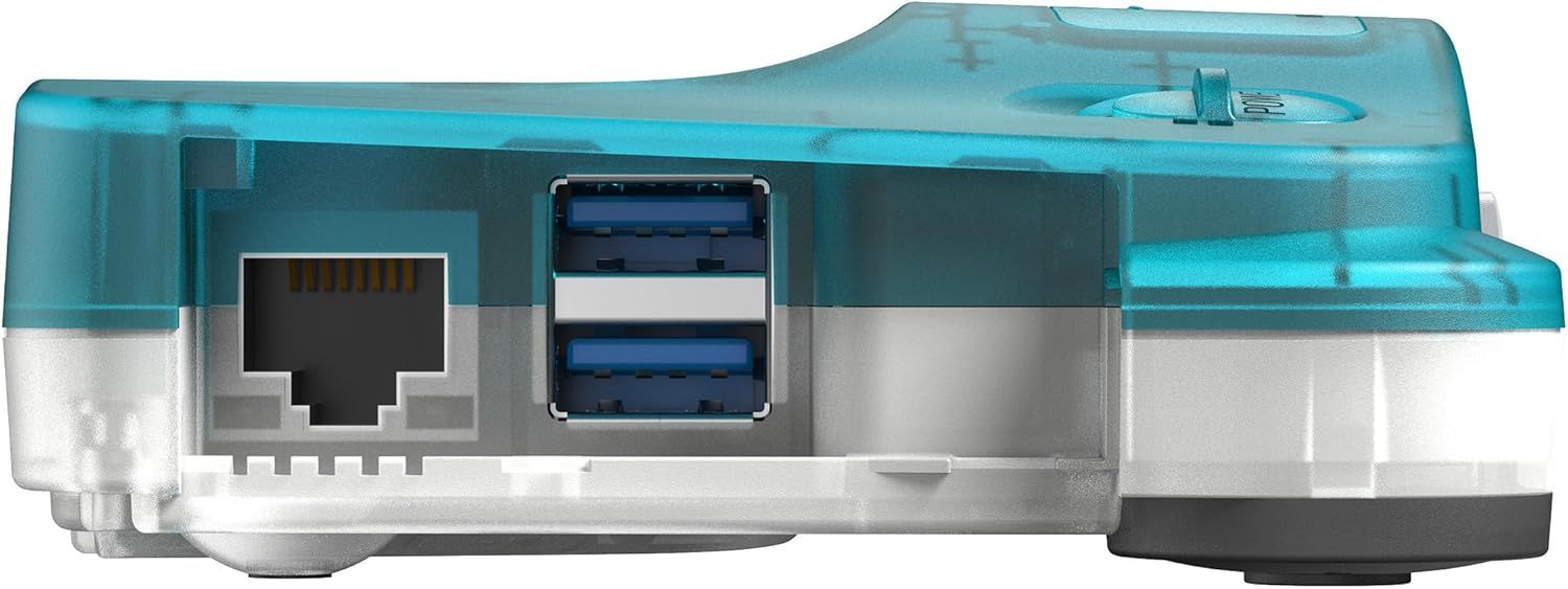 [The 64-bit console (https://www.youtube.com/watch?v=B9CSYcMverU) has been faithfully reproduced in its limited translucent turquoise version. Two USB ports can be seen on the front, while the original Raspberry Pi 5 ports (Ethernet, power, HDMI, USB and microSD card access) are on the rear. As usual, RetroFlag will offer a Safe Shutdown/Reset system with the appropriate buttons.