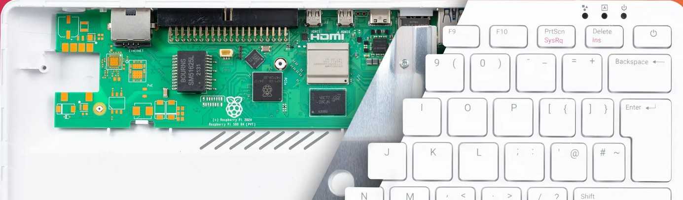 In terms of dimensions, the Pi 500 remains faithful to the Pi 400: 286 mm × 122 mm × 23 mm. As a practical addition, a power button is now integrated into the top right-hand corner of the keyboard.